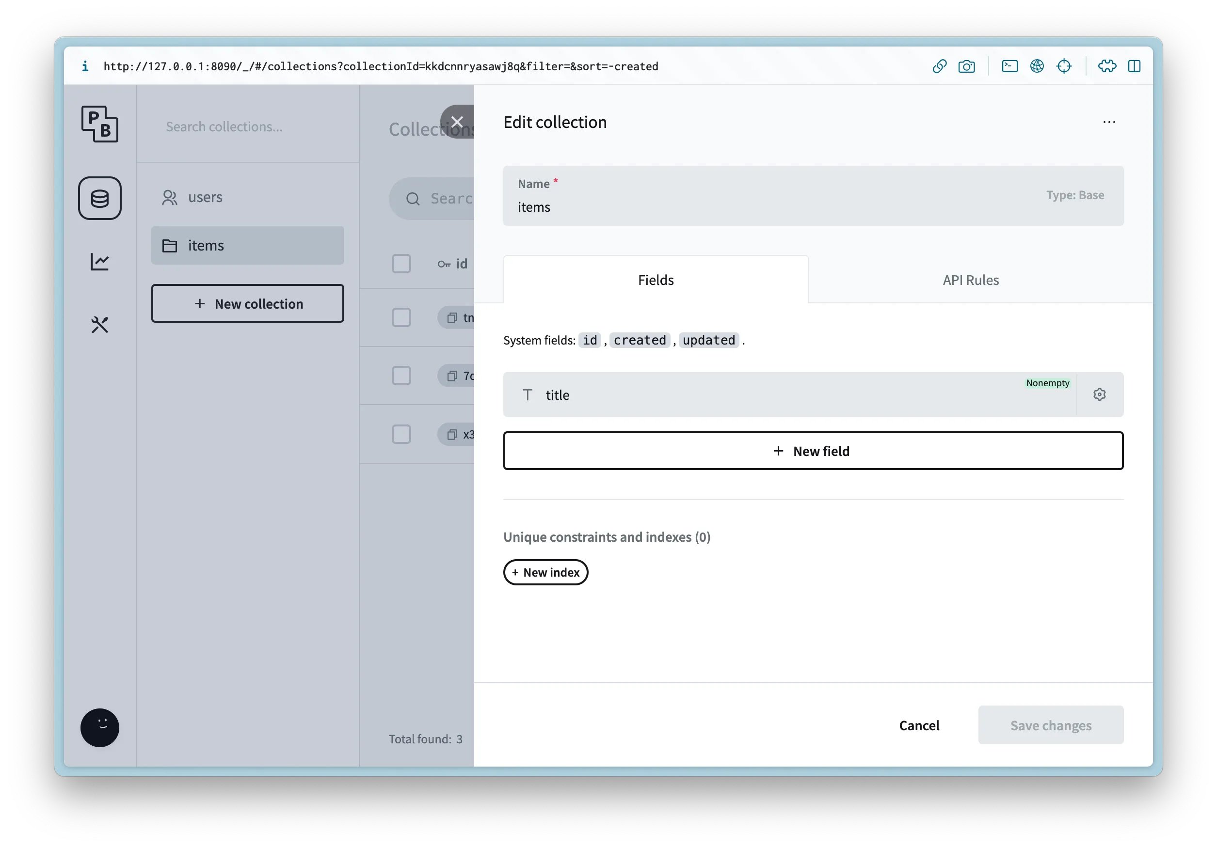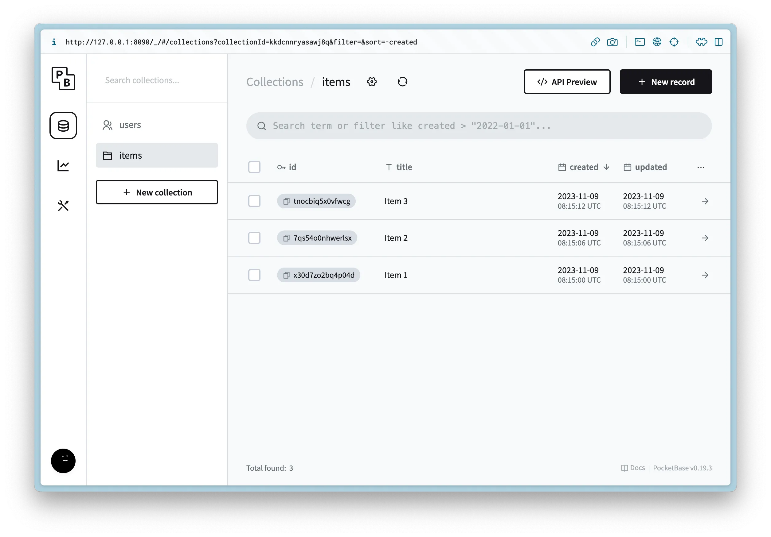 Then if we open up the PocketBase url http://127.0.0.1:8090 and you should see the following for the index route and detail routes: