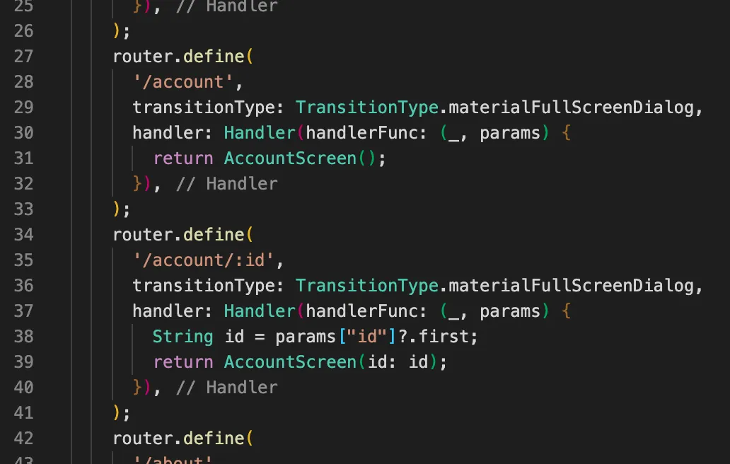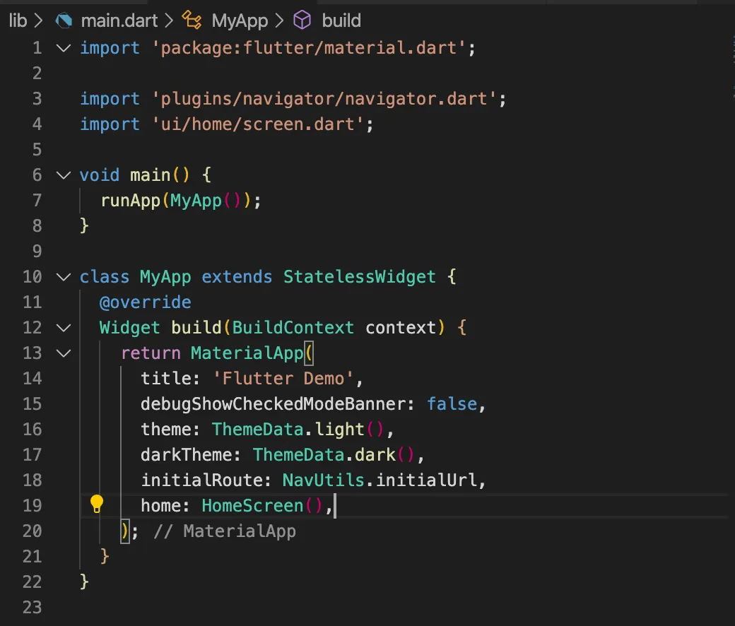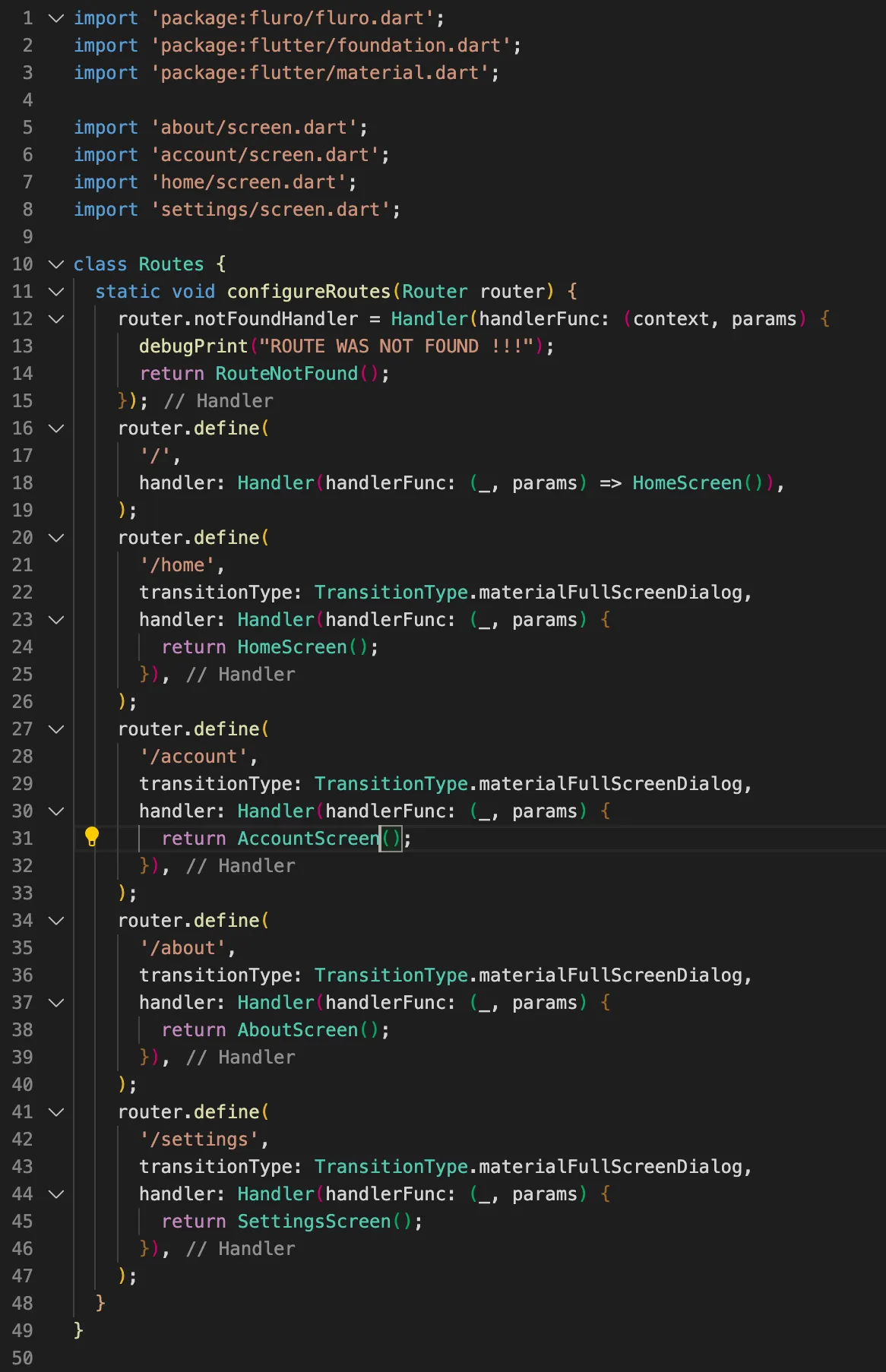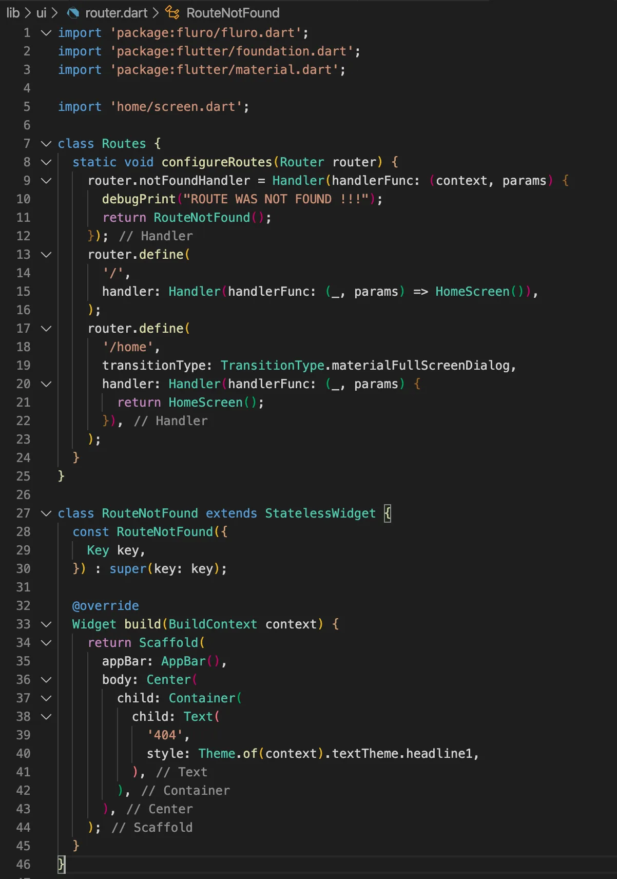 Notice how we removed the “home” field for MaterialApp. This is because the router will handle everything. By default we will go home on “/”