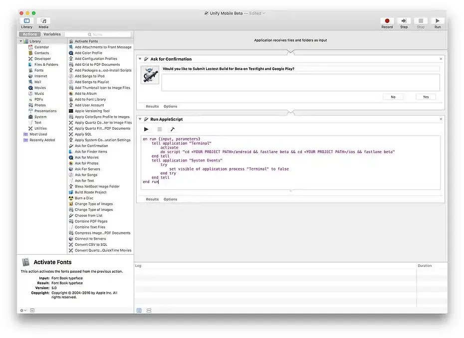 If you want to be able to submit your app to Google Play and the App Store with one click we will be using Automator. Create a new Automator Application. And Search for “Ask for Confirmation” and “Run AppleScript” and drag in.