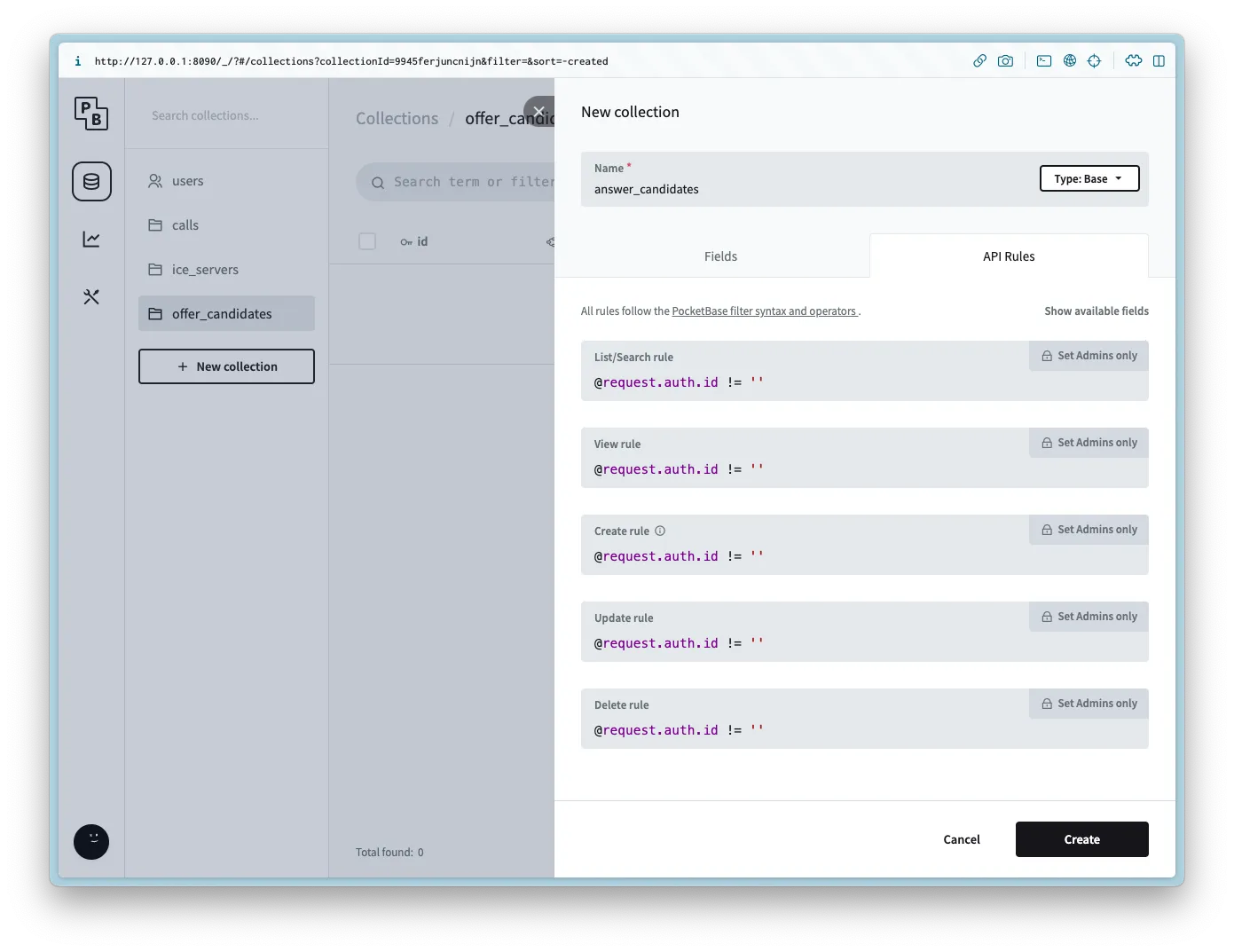 Create a new collection named offer_candidates with the following columns: