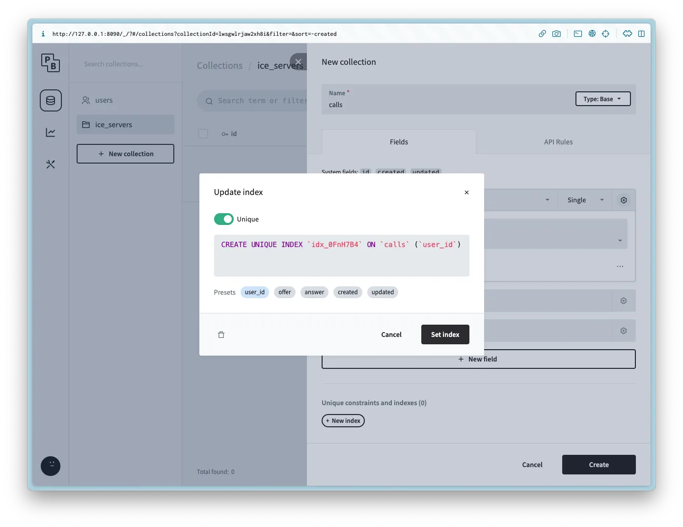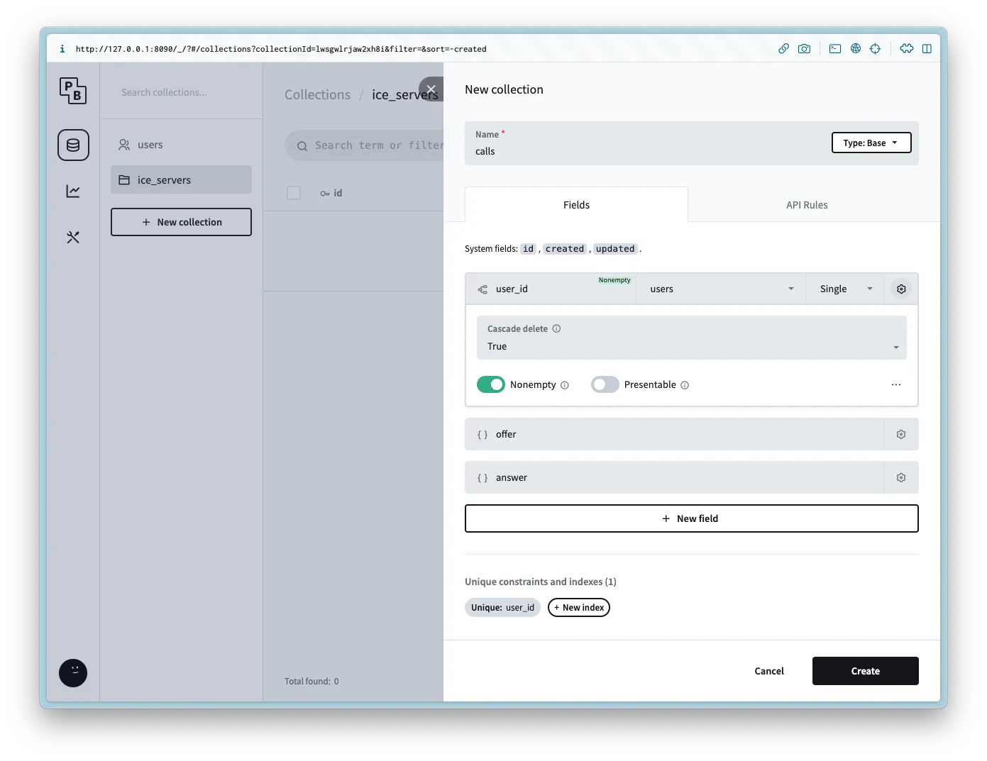 Create a new collection named ice_servers with the following columns: