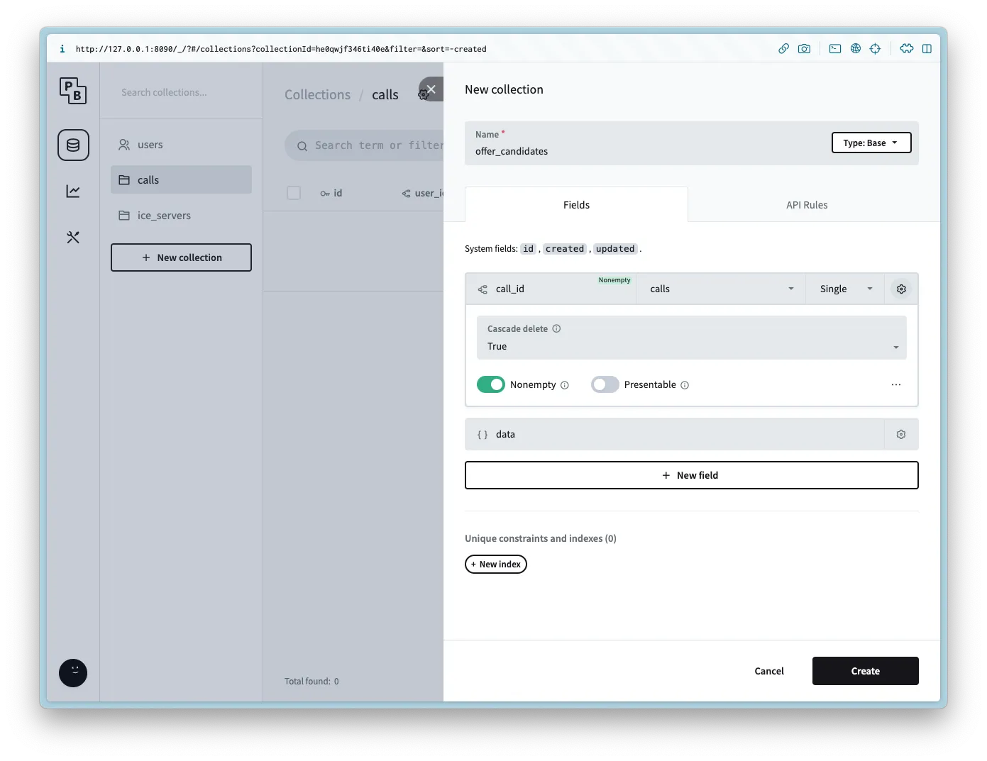 Create a new collection named calls with the following columns:
