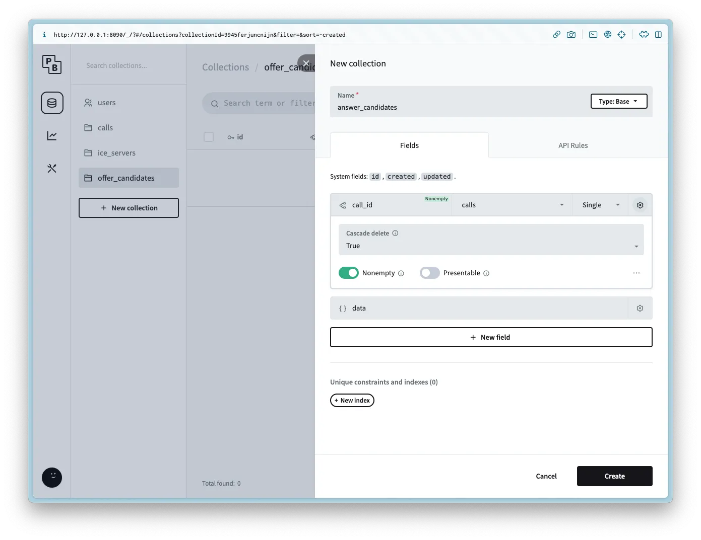Create a new collection named answer_candidates with the following columns: