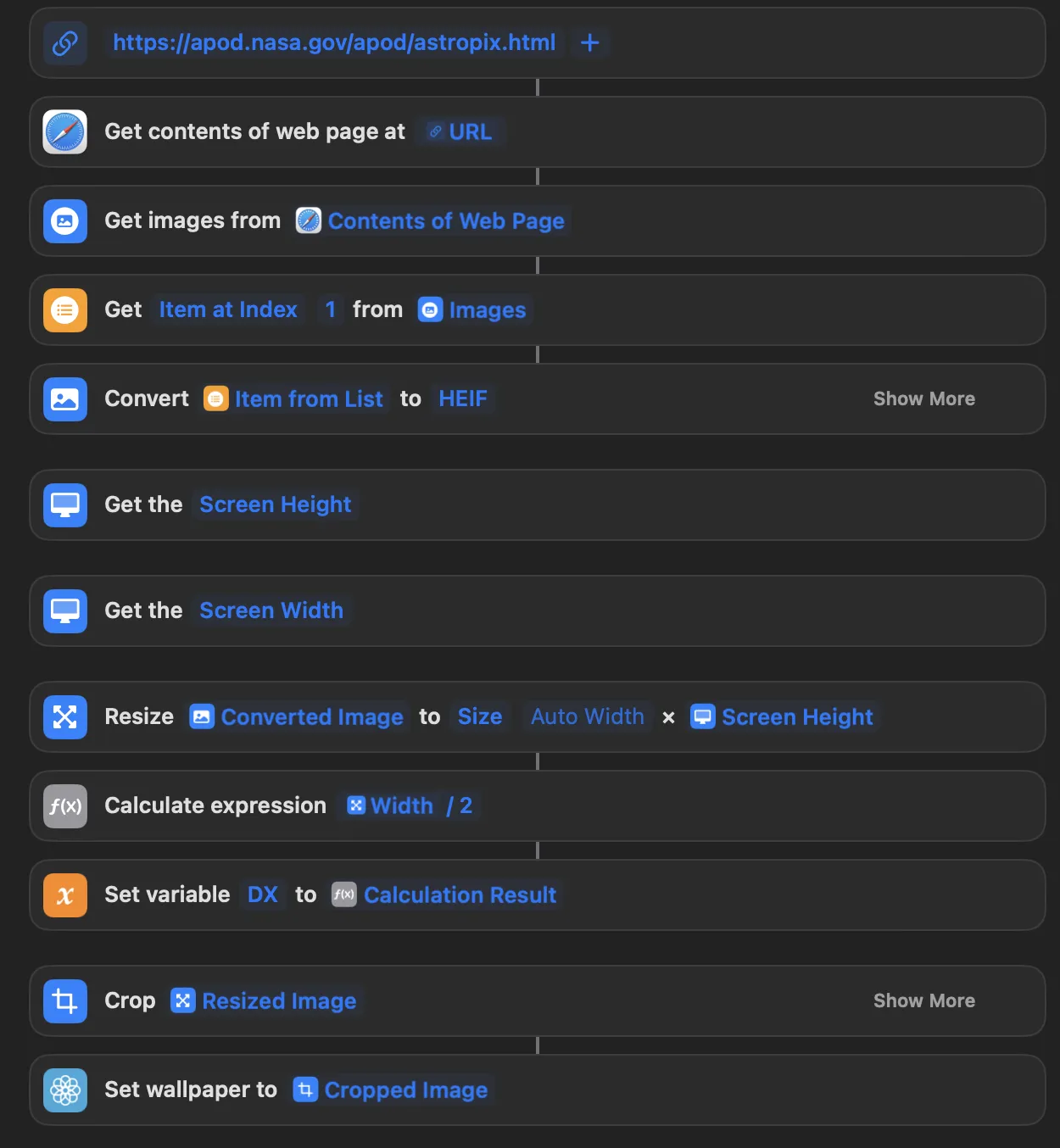 How to set the lock screen or home screen to the [NASA](https://www.nasa.gov/) image of the day using the [public API](https://data.nasa.gov/Space-Science/Astronomy-Picture-of-the-Day-API/ez2w-t8ua) and [shortcuts](https://apps.apple.com/us/app/shortcuts/id915249334).